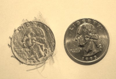 What you do is get a big piece of newsprint, lay it over the gravestone, and rub over it with a charcoal pencil or an oil pastel or chalk – whatever’s handy – like what I did with a silver dollar pictured here. (That silver dollar “coincidentally” is dated the year Mary Steiner– my wife Ruth’s mother, who married Joseph Luttner – was born. Just think, a bit of the physical world in 1886 found its way into my hands and onto this posting and now on to you.)